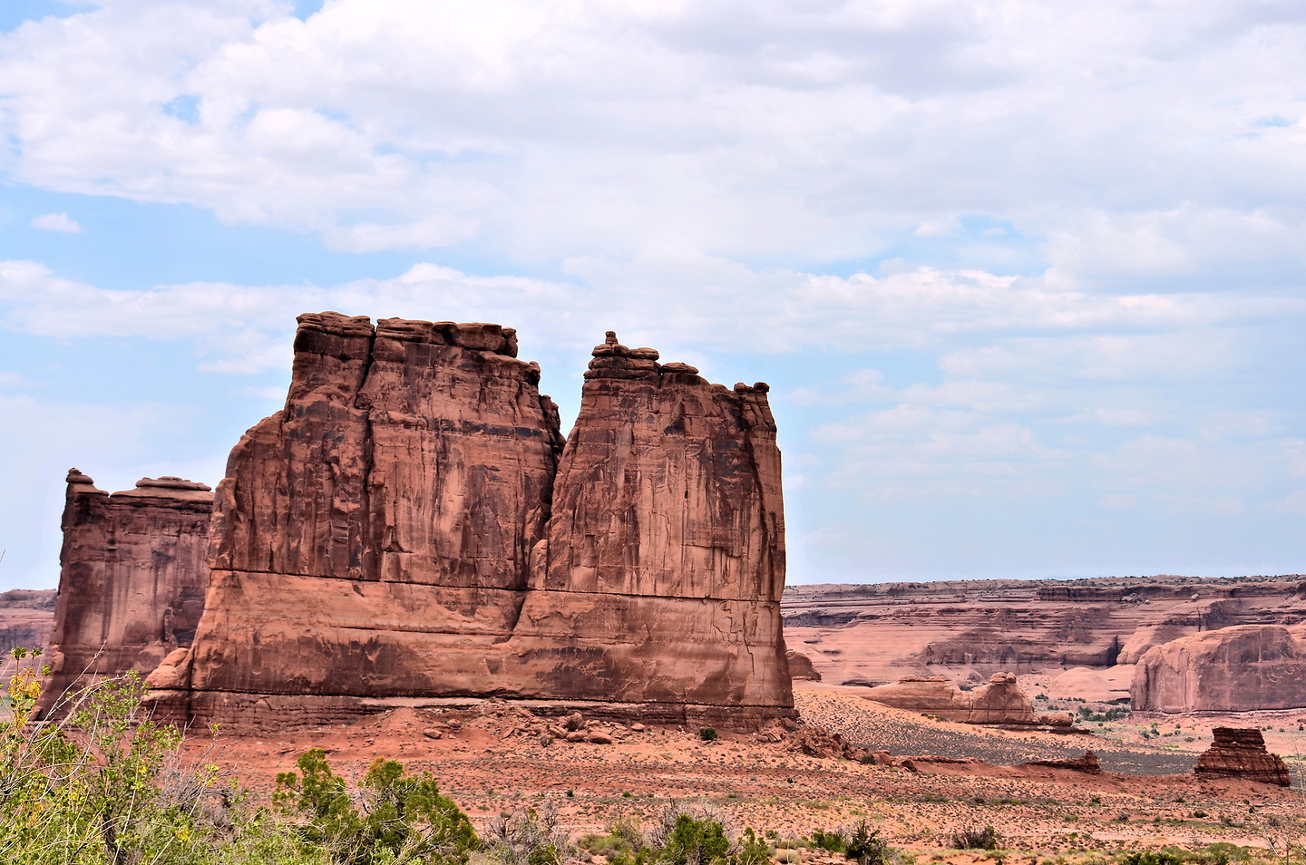 Courthouse Towers Viewpoint, Arches Scenic Dr, Moab, UT 84532If you volunteered to pick up family or friends who walked the .9 miles of the Park Avenue Trail, your rendezvous point is at Courthouse Towers Parking Lot. By the time they finish their trek, you have become very accustomed to this view of the Three Gossips. When they arrive, they will first want something cold to drink. Then, they will go on and on about the great scenery you missed and share every photo they took. That’s gratitude for you.