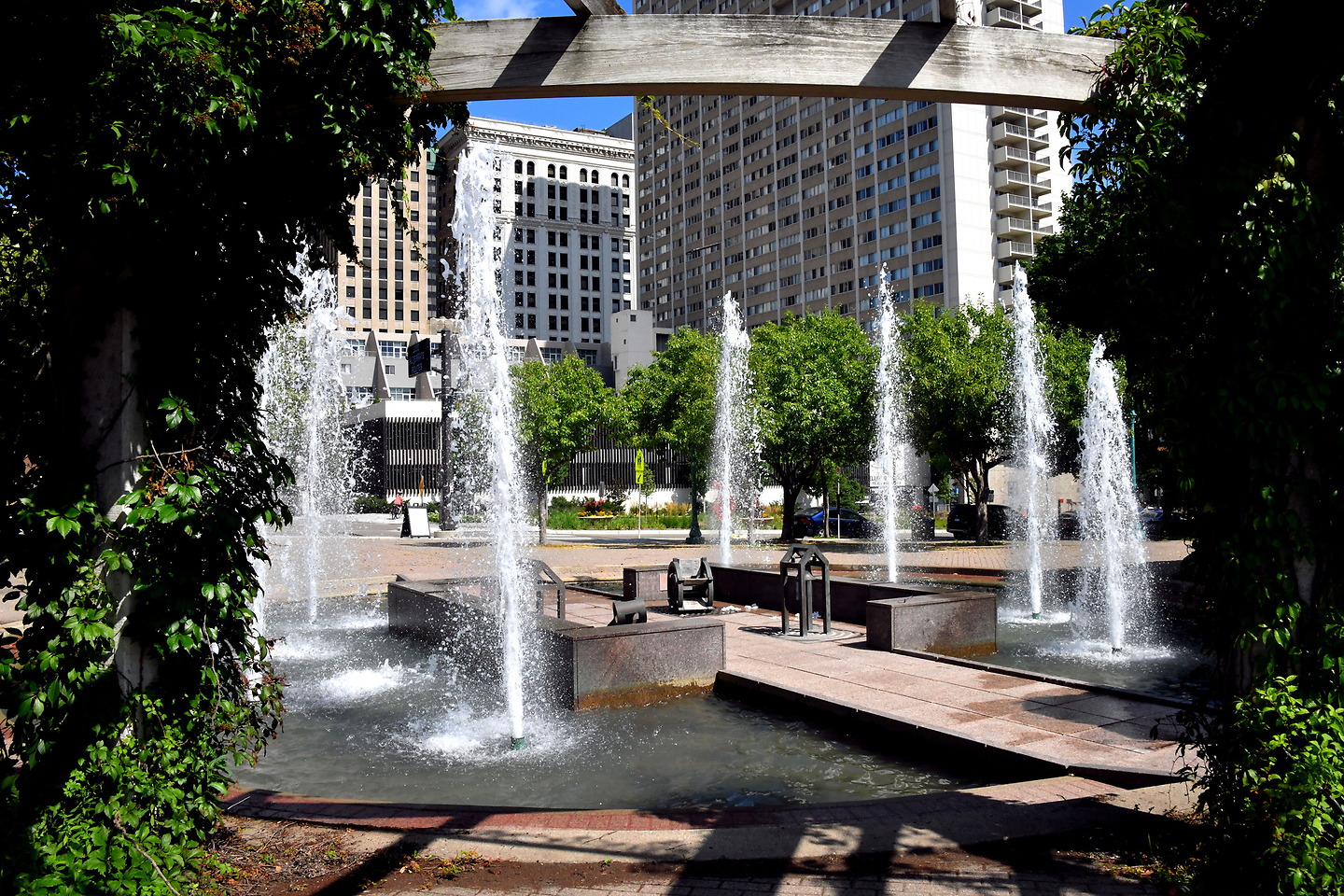 62 Kellogg Blvd, St Paul, MN 55101She was the first to reach the rendezvous point. The large circular water fountain had eight jet streams and a semicircular arbor with cascading vines. The wait wasn’t long. The fountain and four bronze sculptures were designed by artist Cliff Garten in 1990. Terra-cotta reliefs in the granite walkway celebrate historic Saint Paul figures.