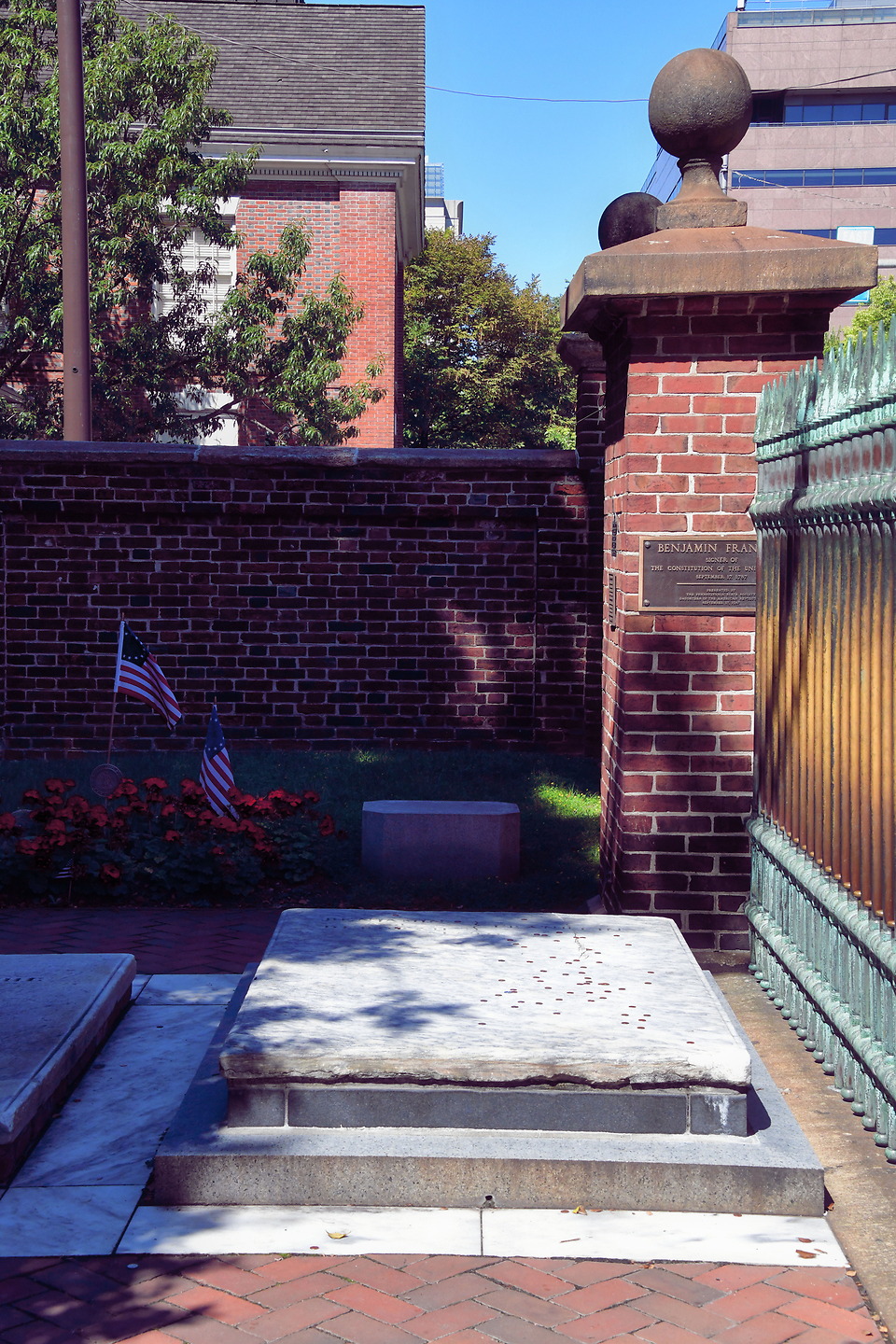 340 N 5th St, Philadelphia, PA 19106A few steps away was the colorless marble slab marking the final resting place of Ben Franklin and his wife. The statesmen, inventor, author, printer and diplomat Benjamin Franklin was 70 years old when he helped draft the Declaration of Independence and became one of the seven Founding Fathers of the United States. He lived long enough to witness the first year of George Washington’s presidency. “Poor Richard” died in 1790 at the age of 84. He is buried beside his common-law wife Deborah Reed. She was 66 when she passed from a stroke in 1774.