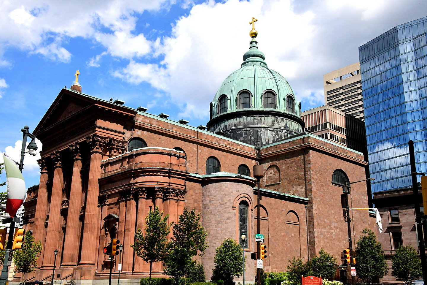 1723 Race Street, Philadelphia, PA 19103Chris marveled at the copper dome, the Neo-classical brownstone façade, and the four massive Corinthian columns before entering a bronze door. The four columns are over 60 feet high with a six-foot diameter. In the niches are statues of Jesus, Mary, Saint Peter and Saint Paul.