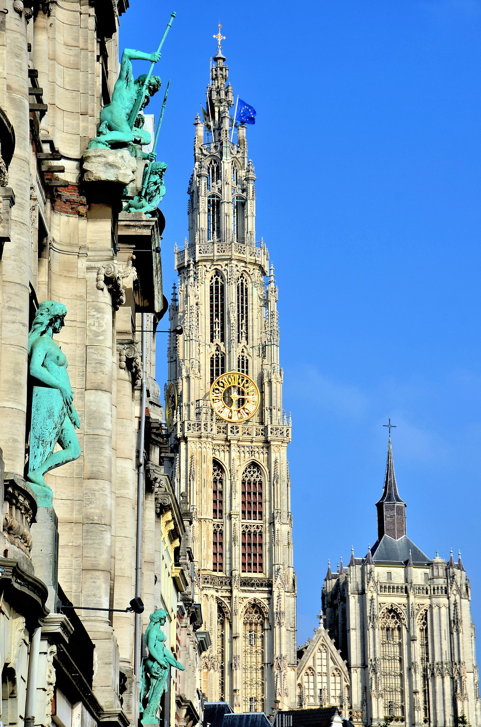 Grote Markt 23, 2000 Antwerpen, BelgiumThe way Michelle’s eyes darted, she seemed to be watching a little girl and boy playing tag around a fountain featuring a bronze statue of Silvius Brabo, a legendary hero of Antwerp. Brabo defeated a giant named Druon Antigoon and is shown throwing the enemy’s severed hand into the Schelde River. The Flemish word for this is handwerpen, hence the city’s name. In the background is the centerpiece of Grote Markt square: Stadhuis. The mid-sixteenth-century City Hall is decorated with European and consulate country flags.