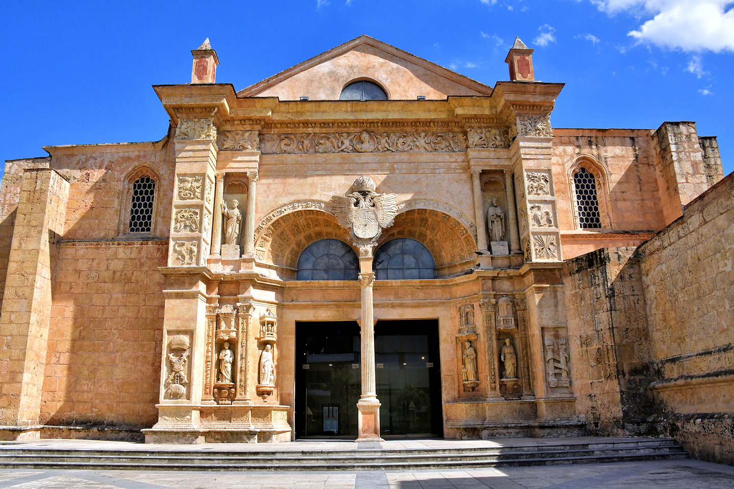 Parque Colón, Calle Isabel La Católica, Santo Domingo 10210, Dominican RepublicThen he walked the crowd toward the oldest cathedral in the Americas, dating back to 1504. Pope Julius II commissioned Cathedral of Santa María de la Encarnación. The Gothic design features a warm-colored coral limestone. The double-eagle relief above the arches at the Great Gate is the coat of arms of Charles V as the Holy Roman Emperor and Charles I while the king of Spain. From 1542 until 1795, the remains of Christopher Columbus were interred within Catedral Primada de América.