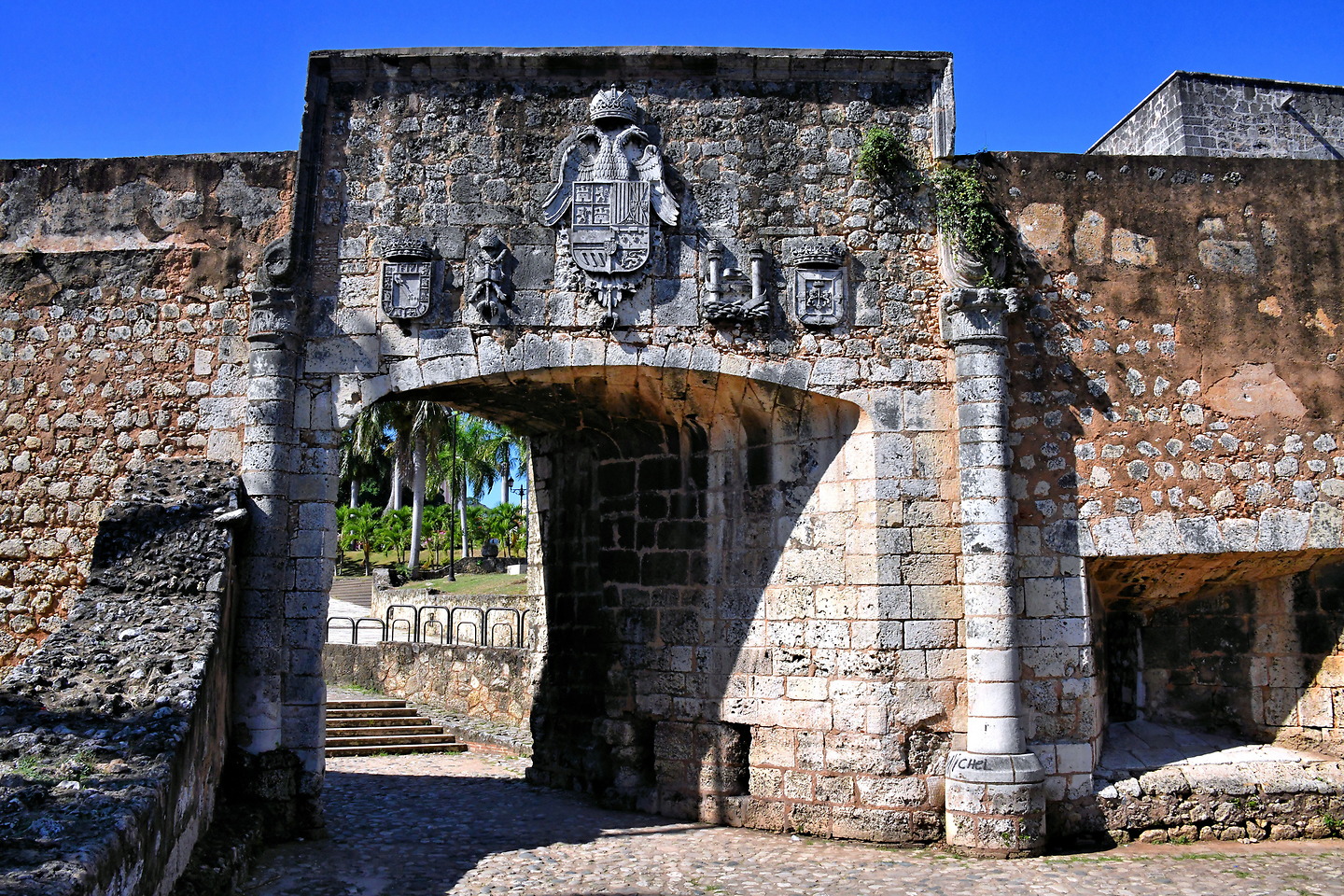 Calle Mercedes & Calle Las Damas, Santo Domingo 10210, Dominican RepublicAnna was fascinated by his knowledge. She kept asking questions about the city’s history as they walked down to San Diego Gate. When this portal was constructed in 1576, Puerta de San Diego was the main city entrance from the port. Hence the alternative name Gate of the Sea. Among the heraldic symbols is the double-headed eagle of Charles I of Spain, also named Emperor Charles V (center). On the right are the Pillars of Hercules and the coat of arms of Santo Domingo.