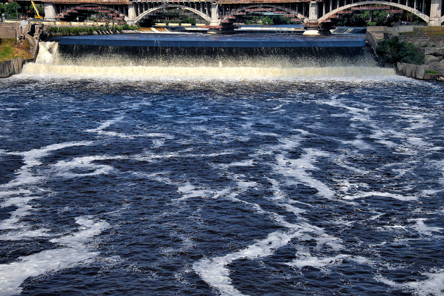 Stone Arch Bridge, Minneapolis, MN 55414“Over there are the upper dam and locks of Saint Anthony Falls, the only natural waterfall on the Mississippi.” The falls were discovered in 1680 by missionary Father Louis Hennepin. His last name is the county where Minneapolis is located. During the second half of the nineteenth century, the power of the 49-foot drop was harnessed by milling operations, resulting in the city’s nickname, “Flour Milling Capital of the World.” The upper dam still services two hydroelectric plants.